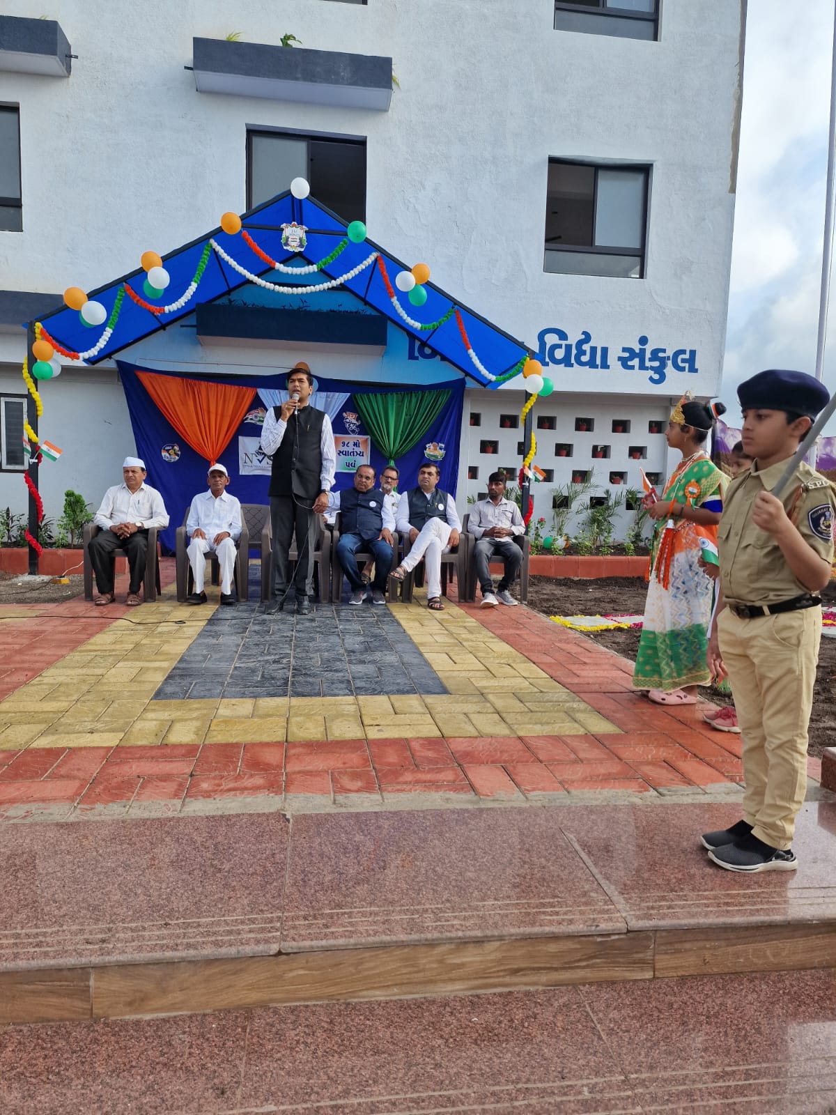 Tricolor was hoisted at the main gate of the school. Then the national anthem